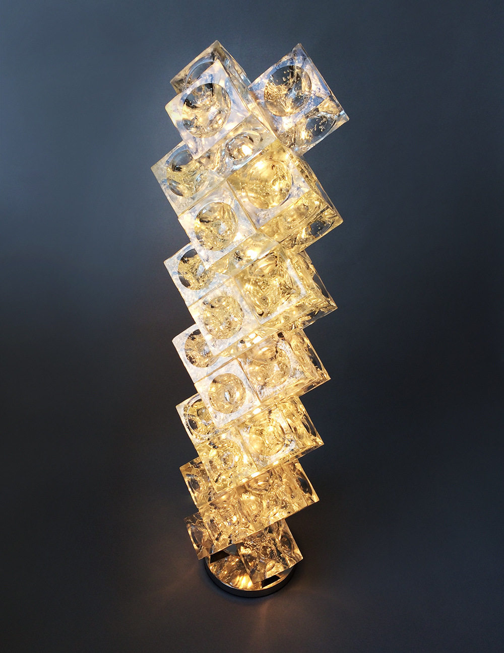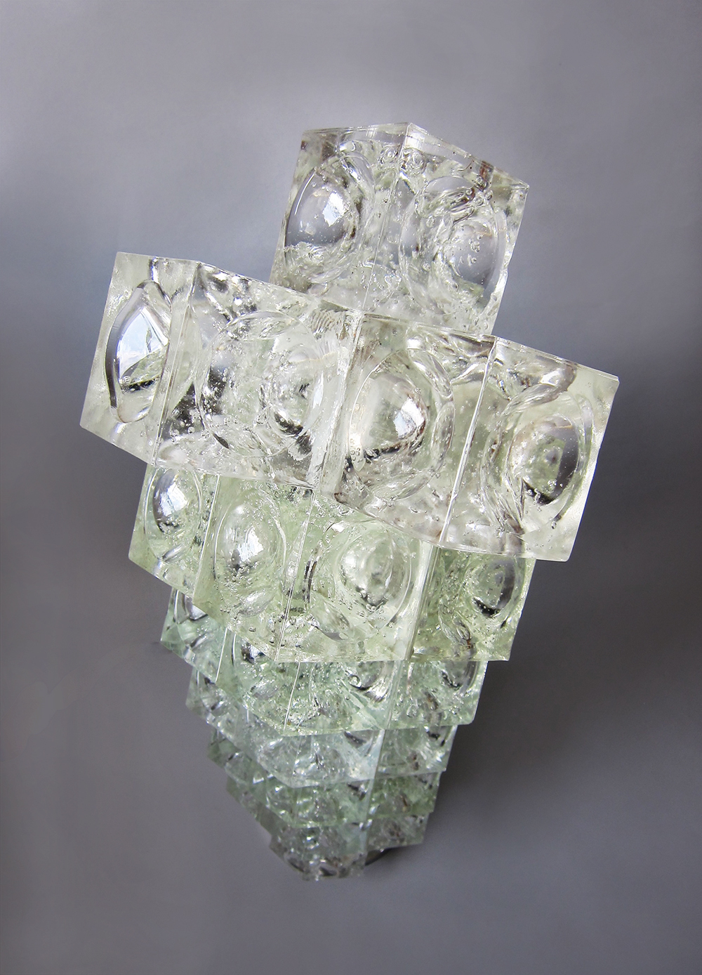 Composition including 36 cubed unrefined glass component parts with an internal hemispheric groove and a stainless steel base