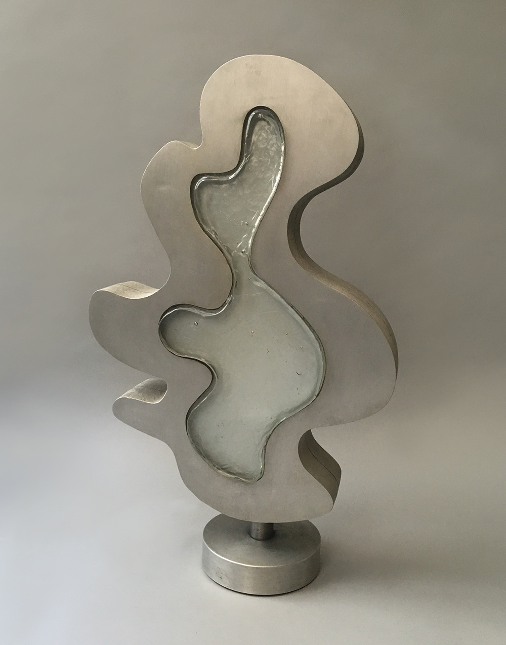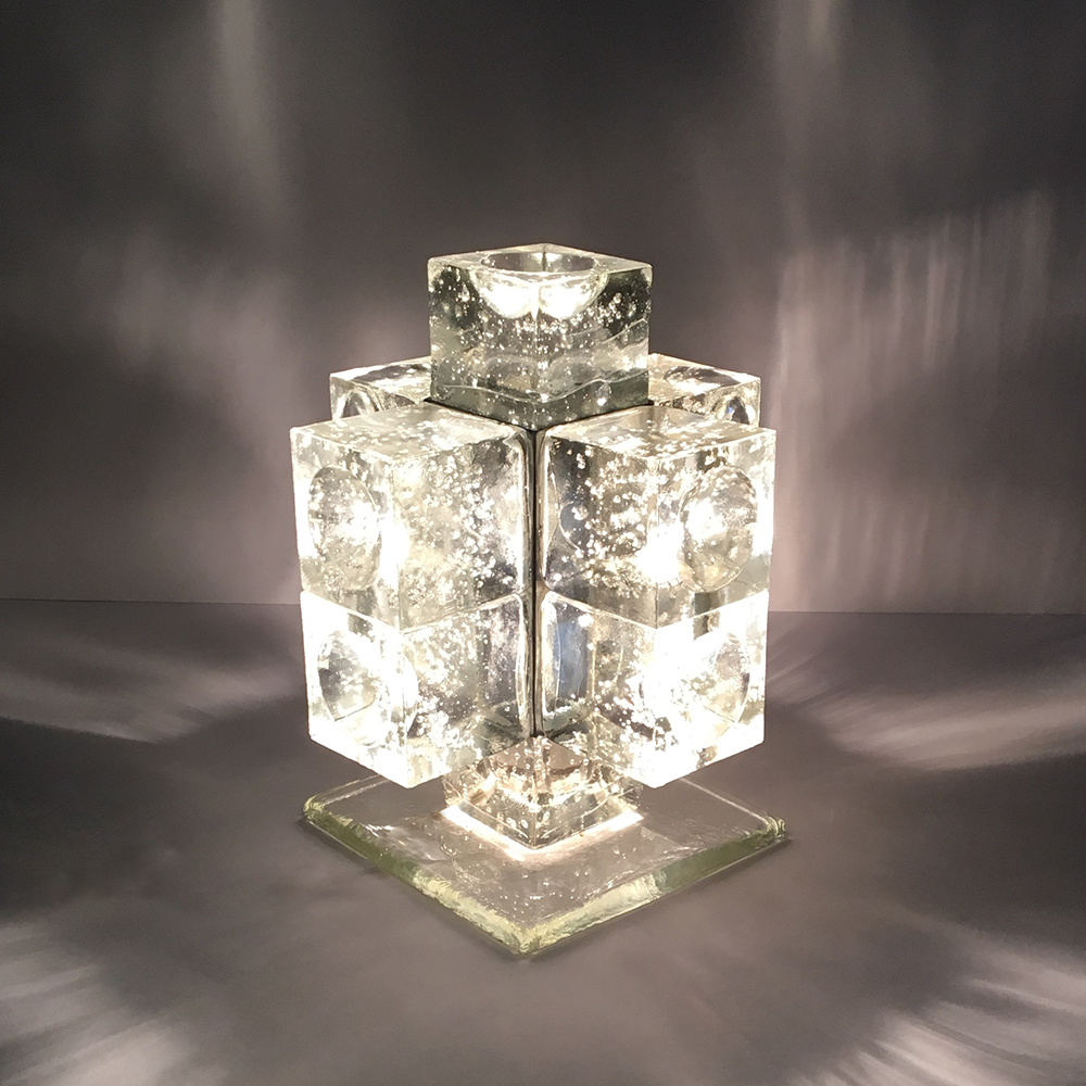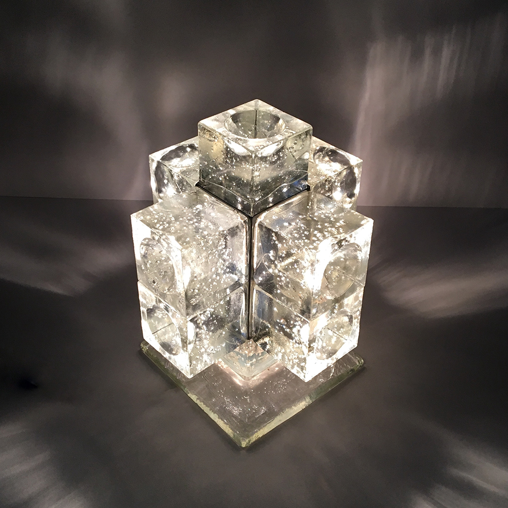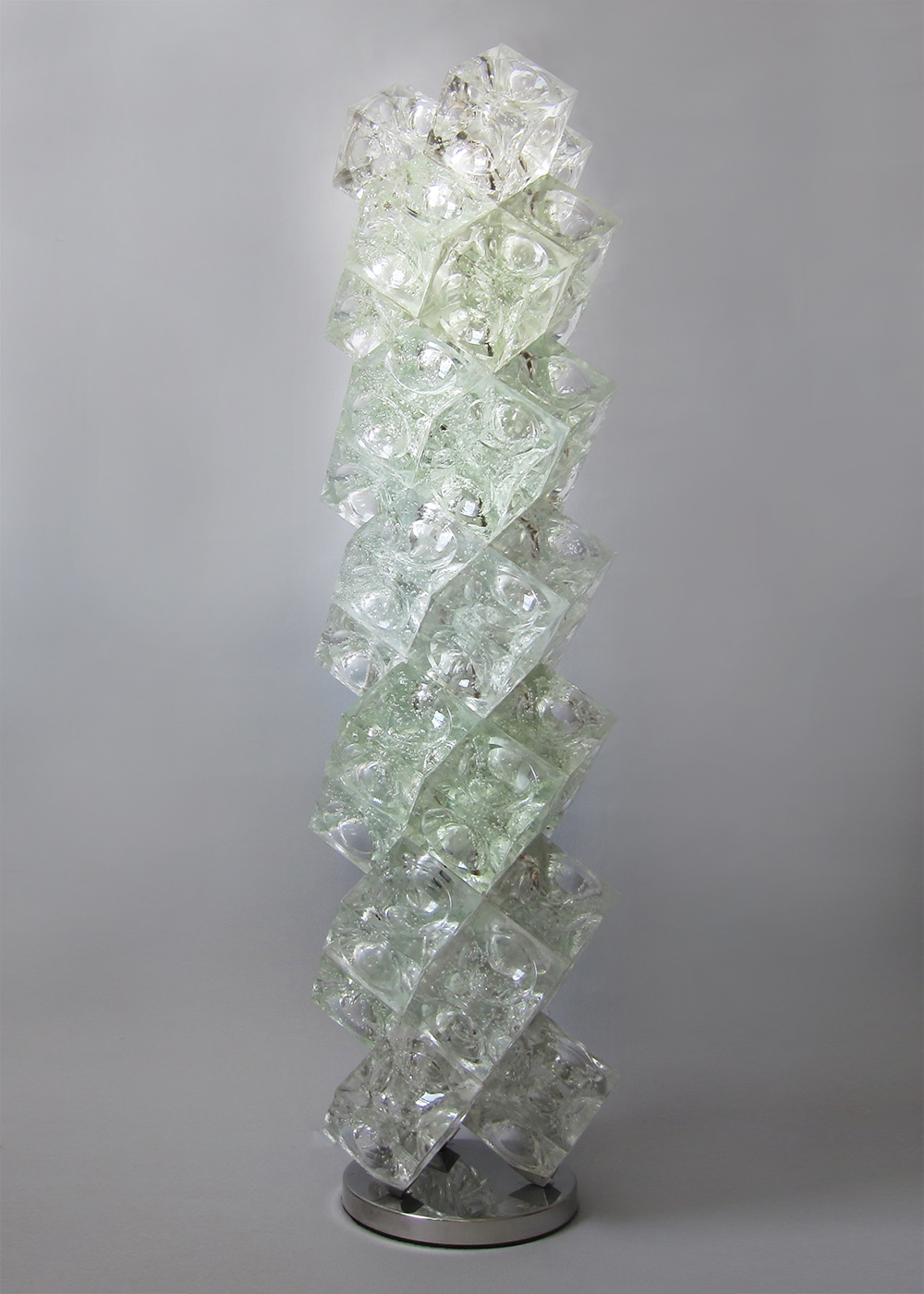 Composition including 10 unrefined glass cube component parts with a single internal hemispheric groove on a cast glass base. Metal internal structure.