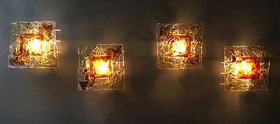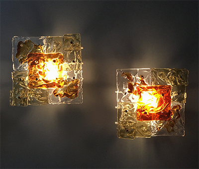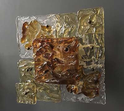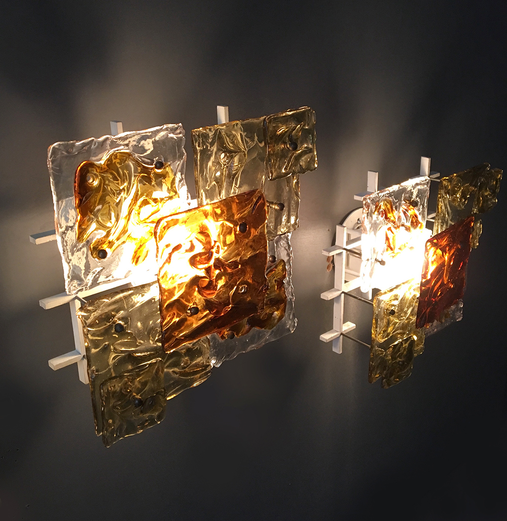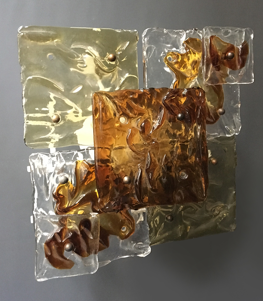 inventory: 729 Venini "Patchwork" sconces c.1965 colored cast glass plates and metal base 11.75" wide x 11.75" height x 6" deep. Murano, Italy