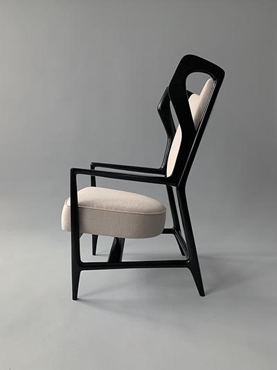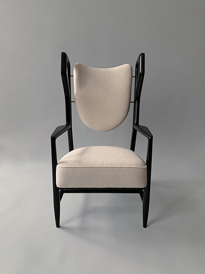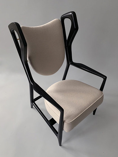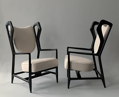 747 Gio Ponti by I.S.A. Bergamo Triennale’ armchairs 1951 ebonized walnut, brass and fabric 41 7/8” h x 24 1/4” w x 28 7/8” d Italy