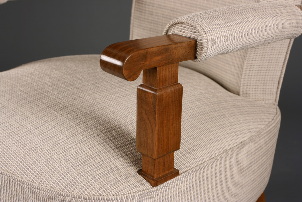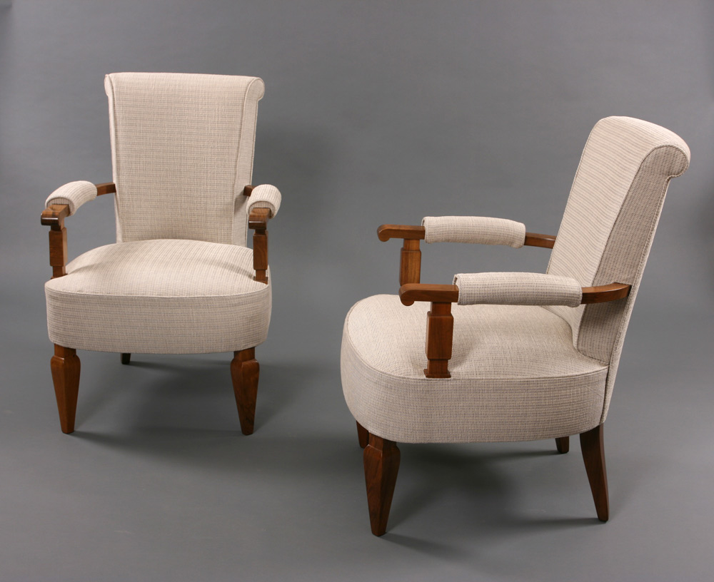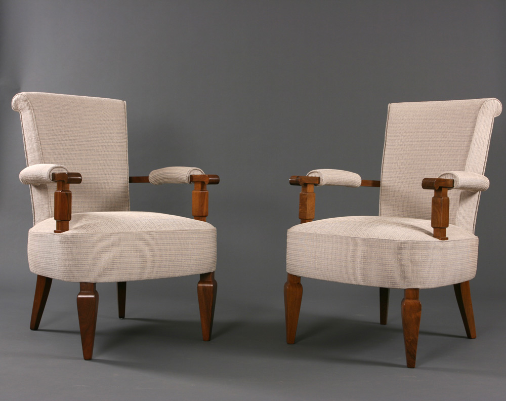 number 461 Jules Leleu pair of armchairs c.1947 French walnut 24" wide x 24" deep x 33 1/2" high France