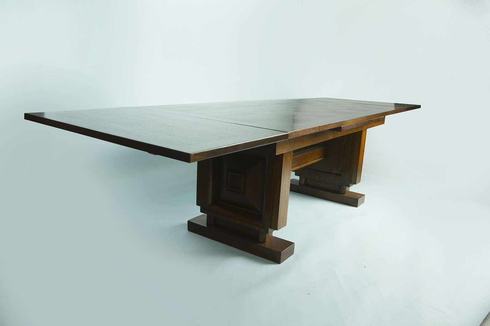number 507 Charles Dudouyt dining table 1947 oak 74 1/2” wide x 37 1/4” deep x 29 1/2” high (22 1/4” wide leaves, 119” total width) France